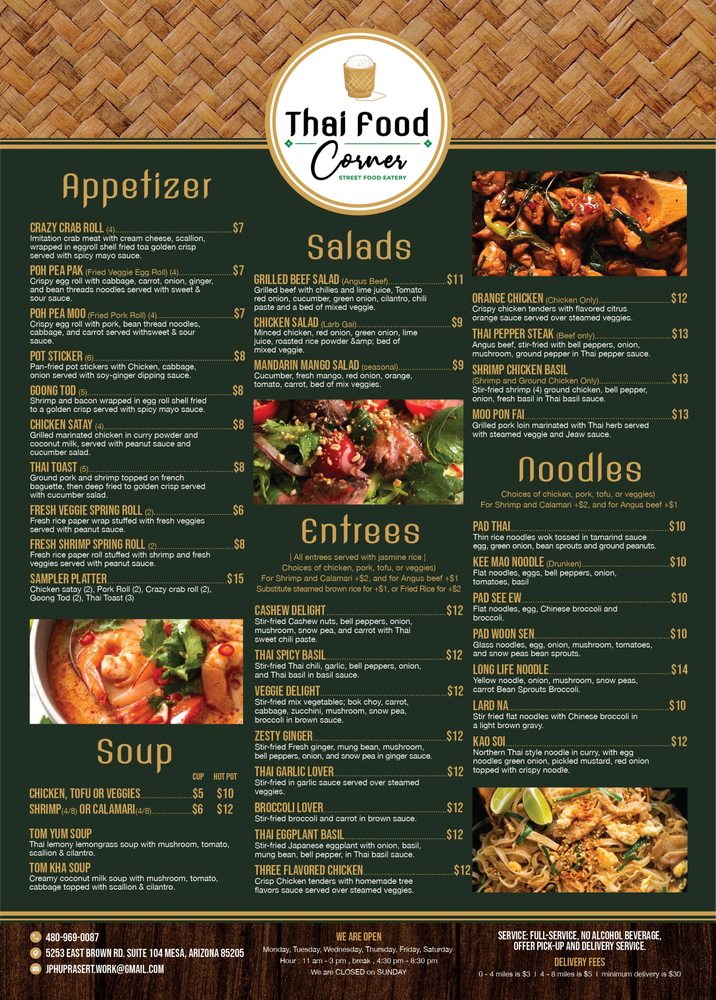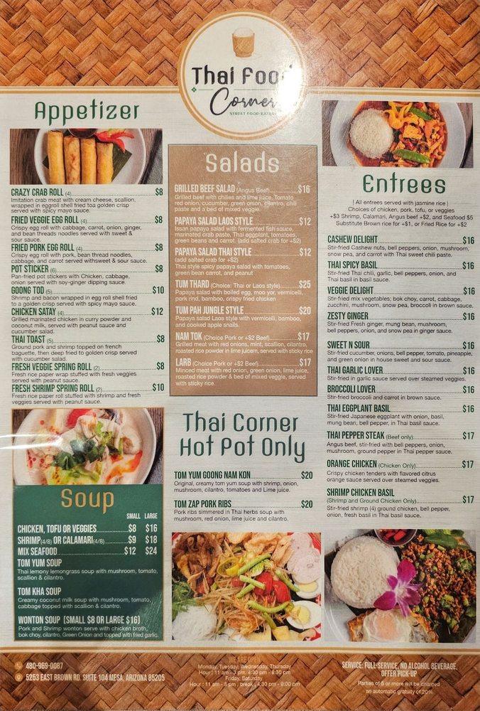 Thai Food Corner is a charming Thai restaurant located in Mesa, AZ. With a wide range of vegan and vegetarian options, this Asian-owned spot offers a diverse menu suitable for all diets. The restaurant prides itself on its inclusive atmosphere, gender-neutral restrooms, and outdoor seating with heated and covered options. Customers rave about the flavorful dishes, with favorites like yellow curry, pad Thai, and pad see ew standing out. Service is fast and friendly, and the portion sizes are generous, perfect for sharing. Despite its small size, Thai Food Corner accommodates large parties and offers catering services. With excellent reviews and a dedicated fanbase, this hidden gem is a must-try for anyone craving authentic Thai cuisine.