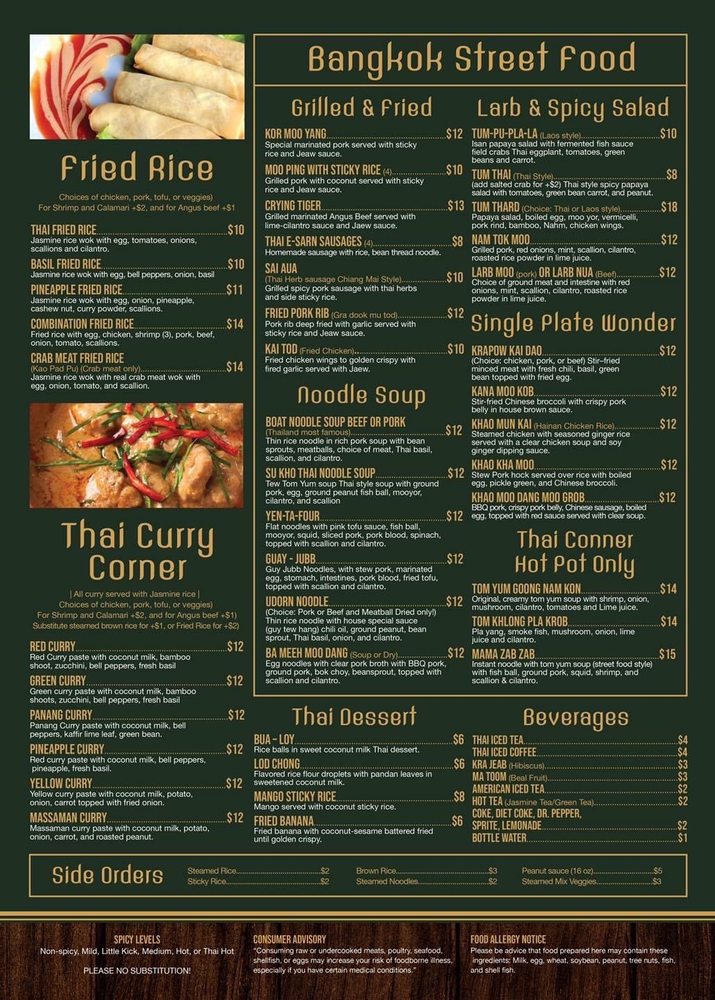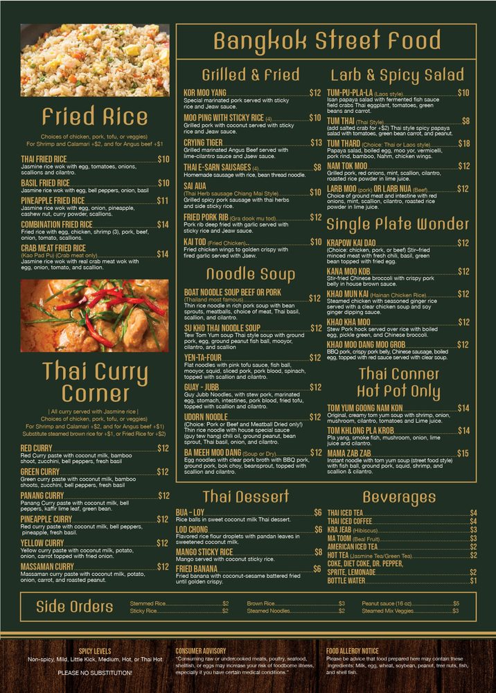 Rama “ ข้าวพระรามลงสรง ” This ancient menu has been introduced and popularized by the Chinese community in Thailand for over years. Choice of Chicken ,Pork over in boiling Bok Choy , broccoli, topped with fried onion and peanut curry sauce. Served with jasmine rice.